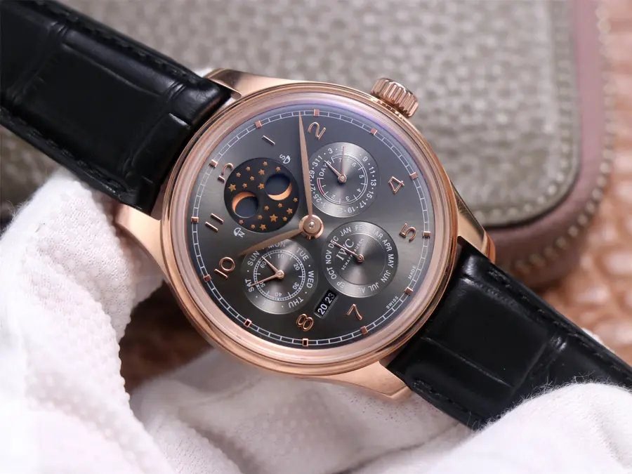 Portuguese series IW5034.01 million calendar watches, the first true permangeable calendar, the use of imported large fine work as the basis for the movement upgrade to 52610 movement, not only to achieve most of the functions and walking stability, repair rate is very low, this is the re-engraving market rarely imperficable complex function watch. Reason to start with: 1, 10,000-8-point position Perennian calendar year normal operation (2017-2024, 2024 free return to the factory to replace the year module), as the original can be adjusted by the case hide button, and better than the original reversible (original) The year is irreversible, after the adjustment is to be repaired at your own expense); 2, the sun and moon star (annual calendar) - date (3 o'clock), month (6 o'clock), week (9 o'clock) are all normal transmission operation, and can be manually adjusted (date by pulling out the second gear two-way adjustment, Month through the 8-point hidden button adjustment, the week can be driven by adjusting the pointer); 3, exquisite workmanship - both inside and outside, German CNC equipment open mold case strap, later manual one by one QC, the shell of each place of the rash and invert almost comparable to the original, movement text font distribution synchronization original, fish scales and other pattern grinding details are very delicate. The arched scratch-resistant mirror is as permeable as the original. 4, hand elegant - size 41 x 13